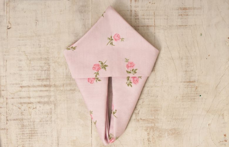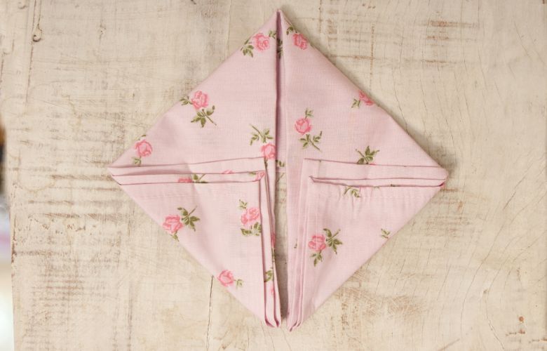 Passo 1: Usando um guardanapo simétrico, dobre ao meio e depois dobre ao meio mais uma vez, formando um retângulo.